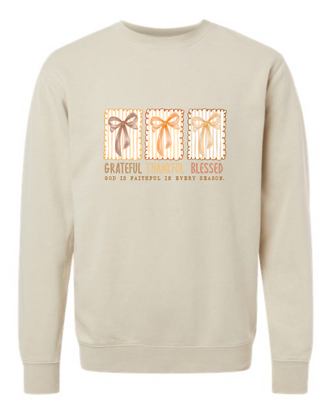 Carry the warmth of the season with this cozy design featuring three autumn-toned bows and an uplifting reminder: “God is faithful in every season.” Perfect for fall gatherings, Sunday wear, or everyday comfort.