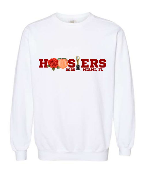 Show your Hoosier pride in style with our Hoosiers 2026 Crewneck, designed to celebrate an unforgettable year in Miami, Florida. This classic white crewneck features bold crimson lettering accented with a rose, peach, and championship-inspired trophy graphic for a look that’s equal parts tradition and celebration.